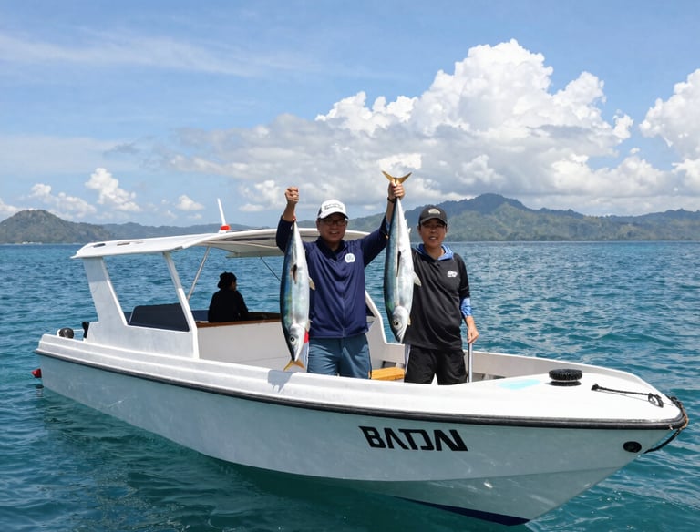 Traditional wooden boat sailing near the shore of Bali with lush green hills.